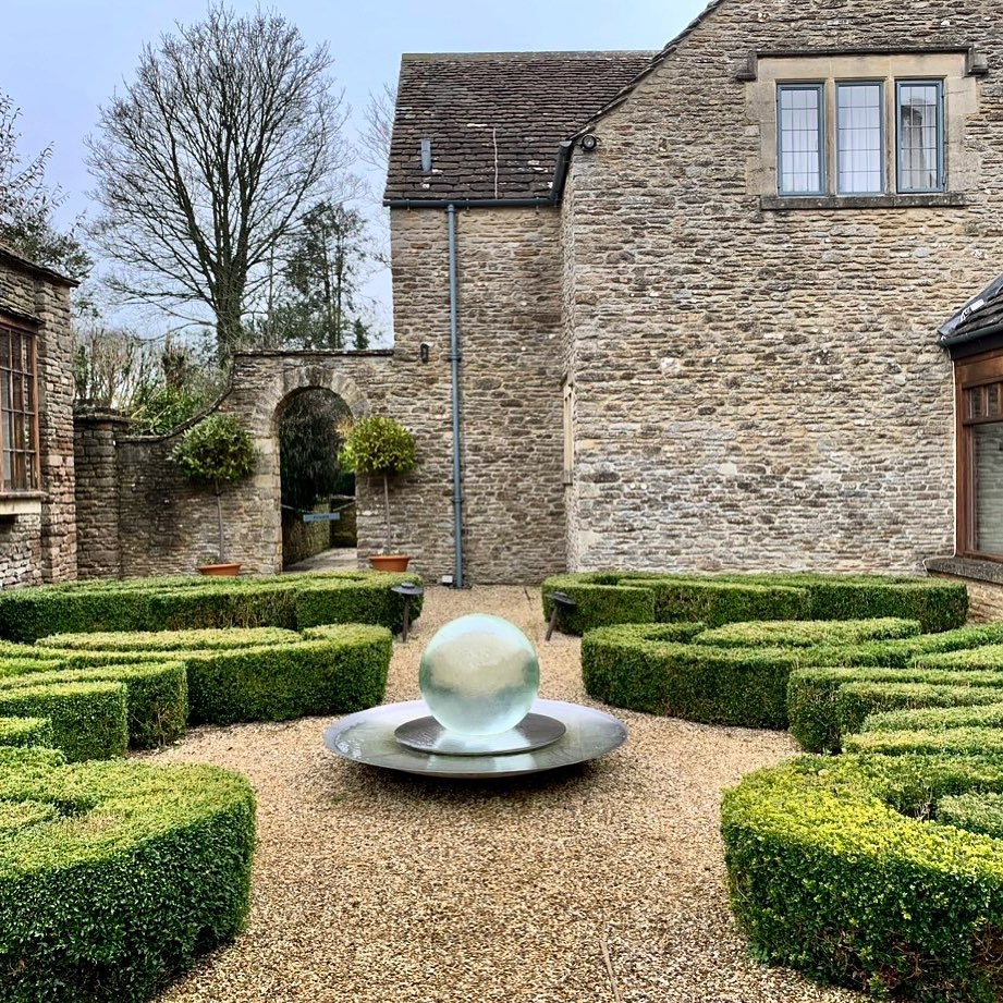 Tucked away in the serene gardens of Whatley Manor Hotel lies a breathtaking spectacle—a vision of elegance and tranquility—the Aqualens sphere fountain. This mesmerizing water feature stands at the heart of the garden, its smooth, glistening sphere capturing the reflections of the surrounding landscape as water cascades seamlessly over its surface. A true masterpiece of design, the Aqualens fountain transforms the garden into a space of stillness and contemplation.