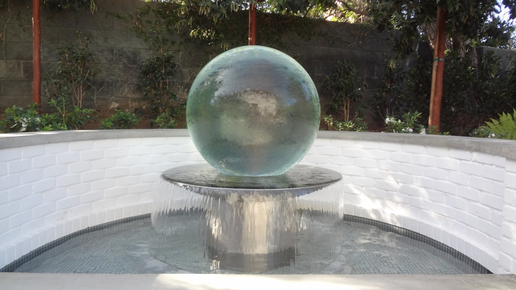 This 24-inch Aqualens sphere in a 5-foot dish overflows into a lower basin, filling the courtyard with movement, sound, and shimmering reflections.