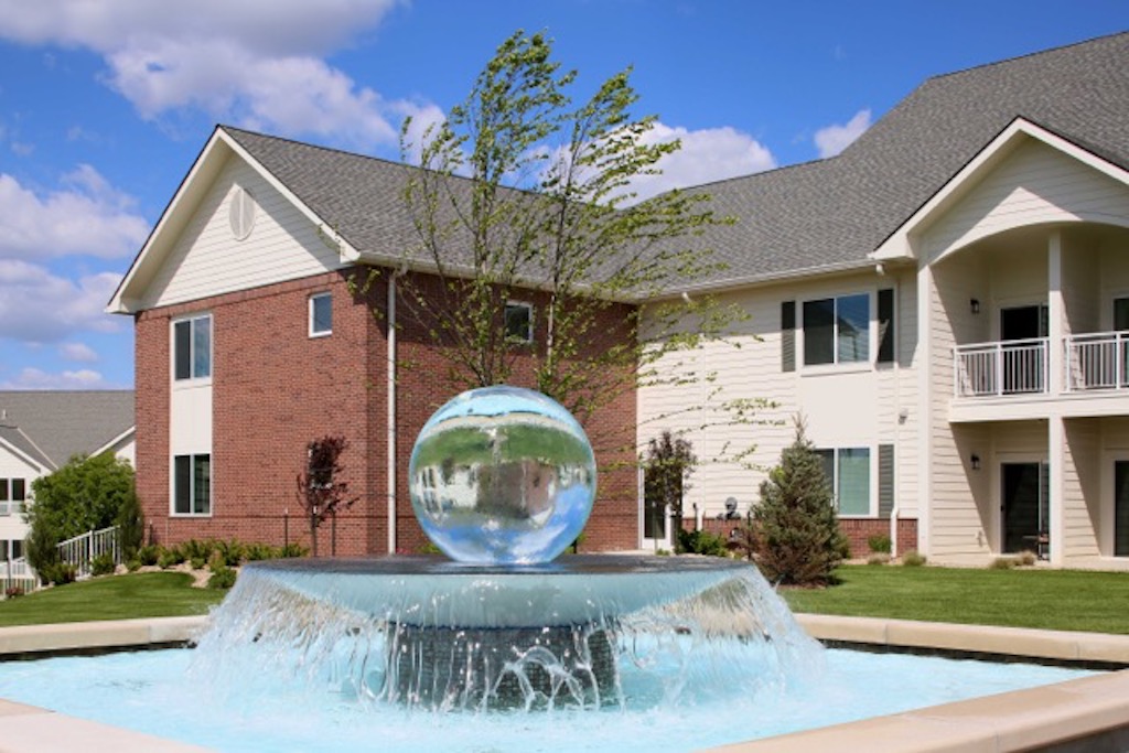 At this residential apartment complex, a 48-inch Aqualens sphere in an 8-foot dish overflows into a lower basin, providing residents with a striking focal point that blends modern elegance with soothing sound and movement.