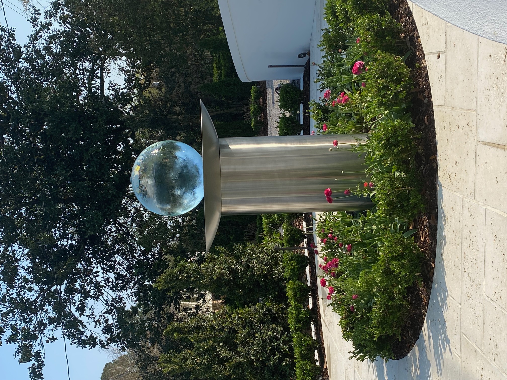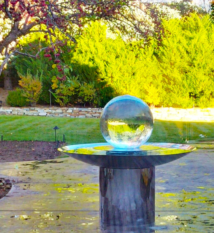 This 2ft sphere in 4ft dish with a 4ft tall pedestal easily is the focal point of the garden.