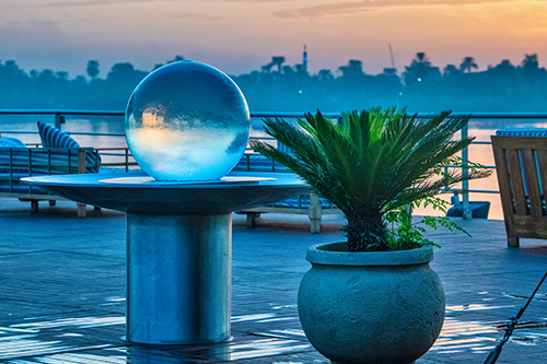At sunset on a cruise ship in Egypt, the Aqualens sphere rises on its pedestal, reflecting the glowing horizon and the tranquil beauty of the sea.