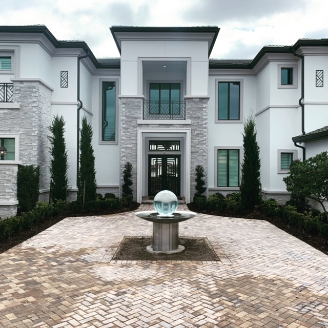 In the center of a brick courtyard, a 2-foot Aqualens sphere in a 5-foot dish on a 2-foot pedestal creates a refined focal point that enhances the space with reflection and elegance.