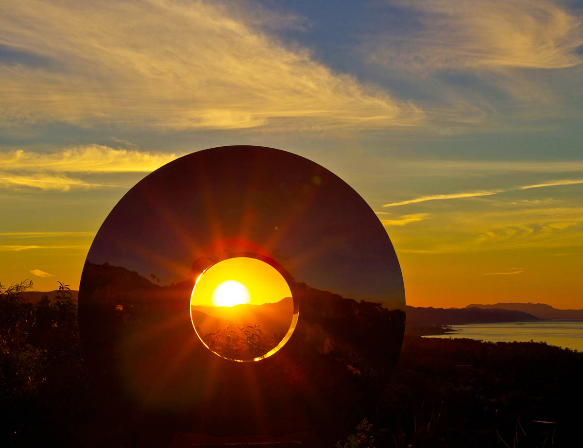 Through the open center of the Steel Eye, the setting sun becomes framed as part of the sculpture itself, uniting art and nature in a single view.