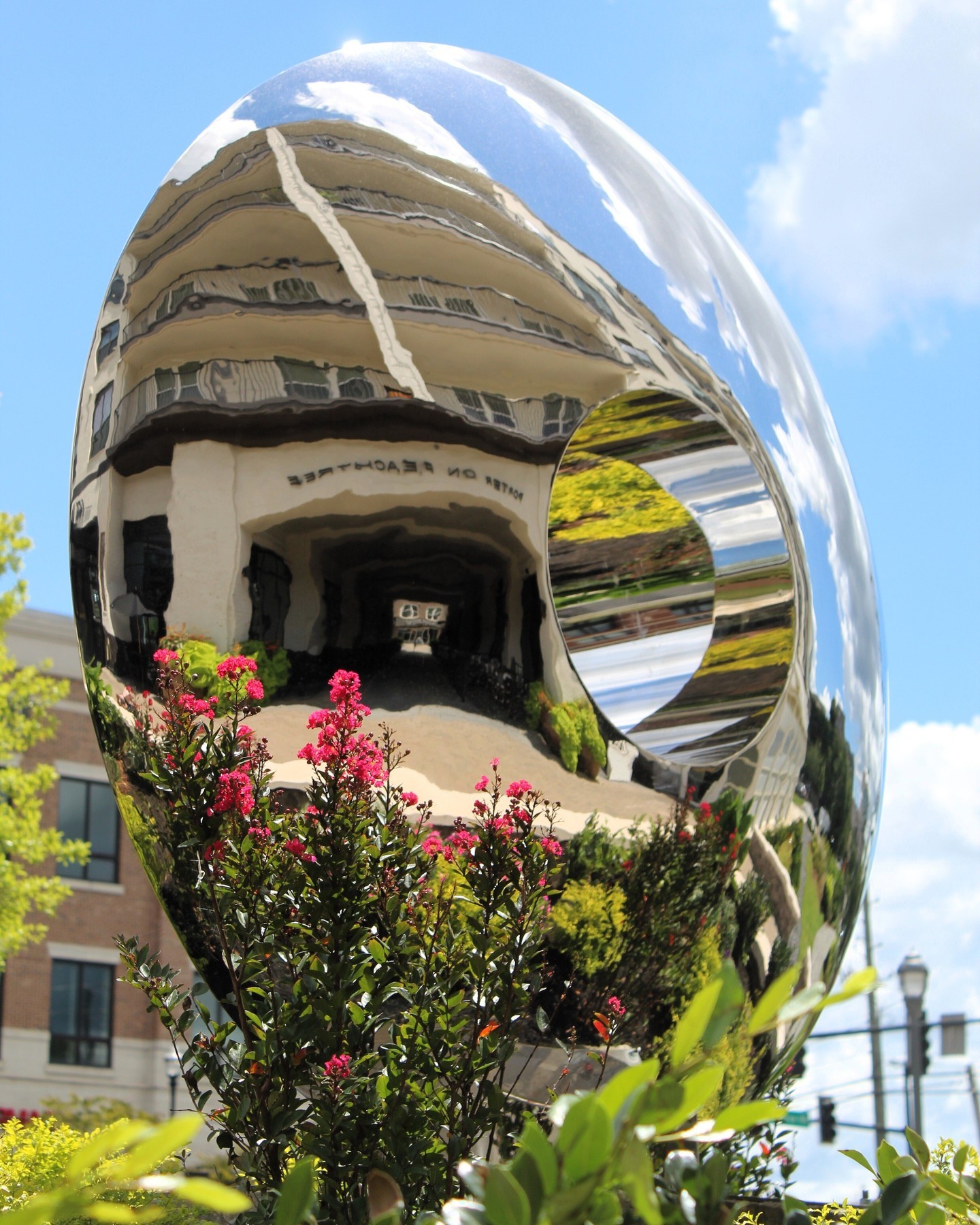 The sculpture is formed from two stainless steel lenses, joined to create the shape of a giant eye and set on a stable base. At its center, an open eye hole invites viewers to look through, play with perspective, and experience unique reflective and acoustic effects.